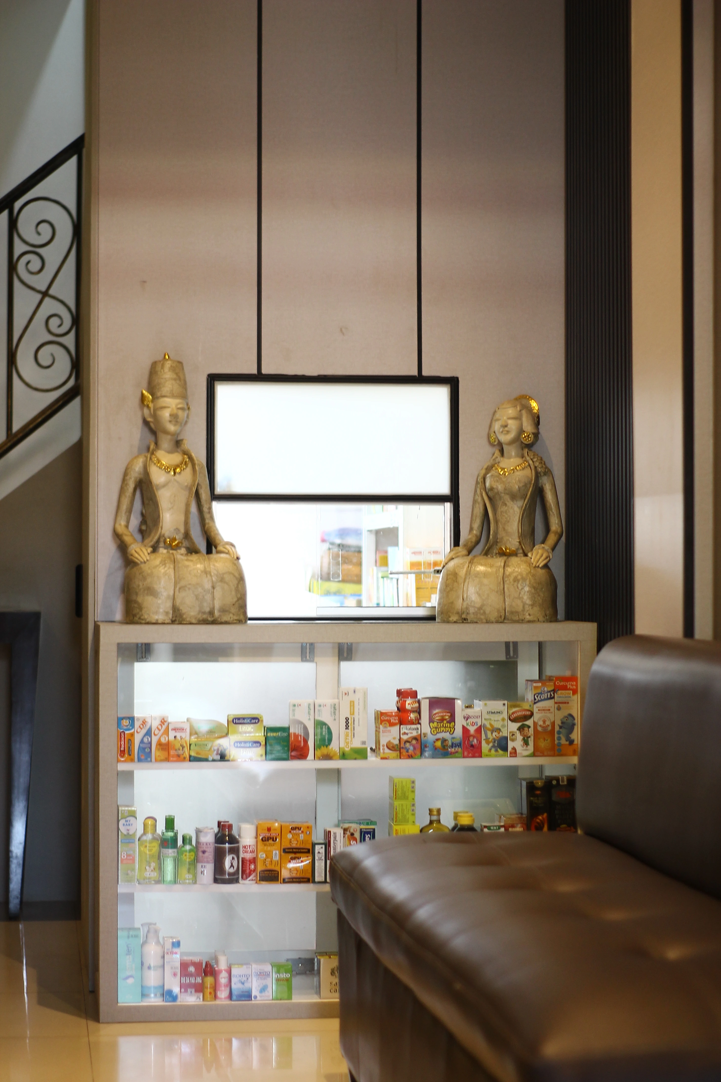 Area Tunggu yang Nyaman dan Etalase Produk. Interior klinik yang hangat, dilengkapi dengan etalase berisi produk perawatan gigi dan mulut yang direkomendasikan dokter.