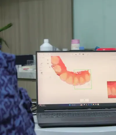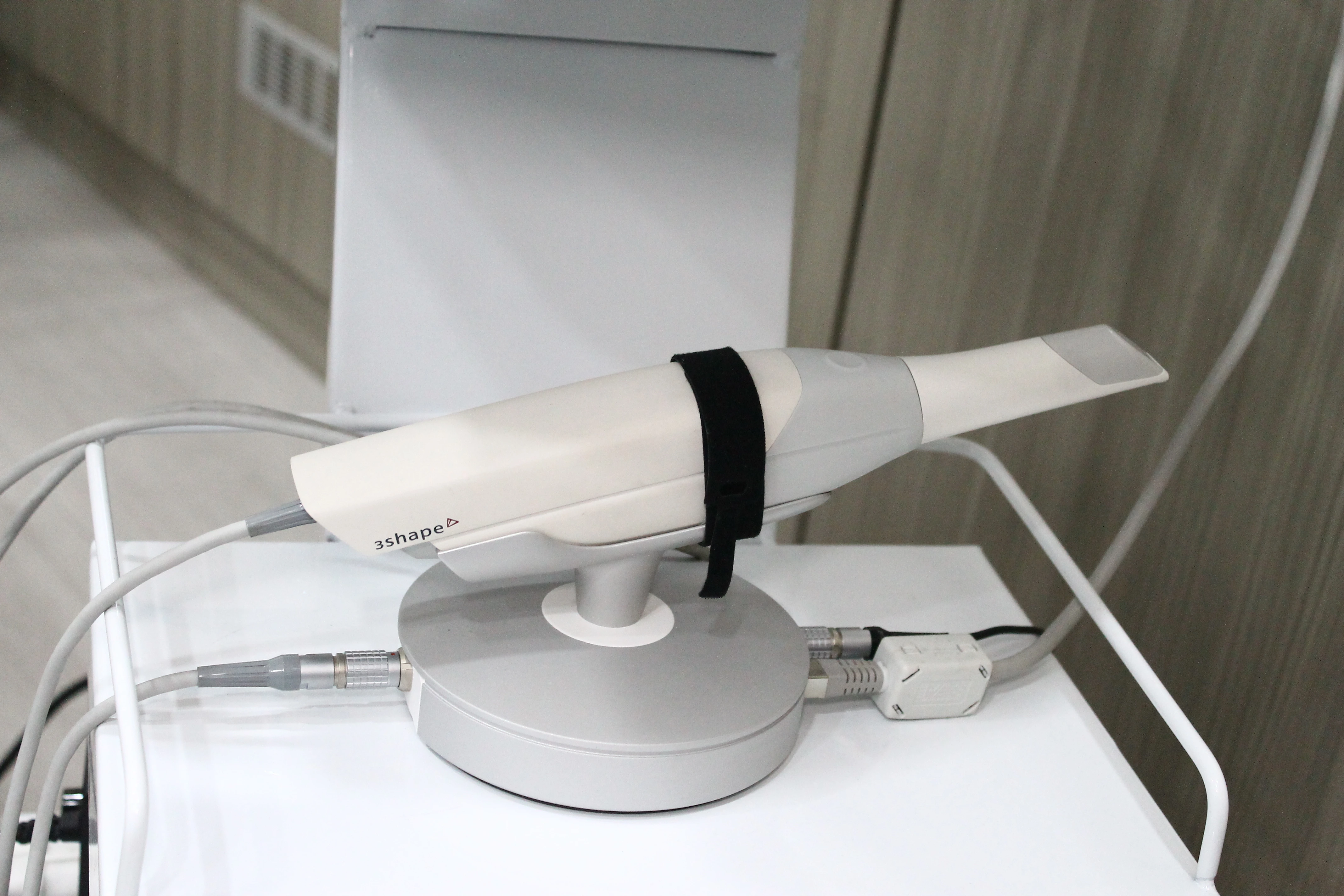 Intraoral Scanner 3Shape. Penggunaan alat scanner digital untuk pencitraan gigi yang cepat dan akurat, menggantikan cetakan konvensional yang tidak nyaman.